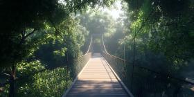 Sunlit Pathway A Serene Wooden Bridge Through Lush Greenery