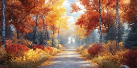 autumn fall foliage leaves trees forest path road landscape nature scenery season colors red orange gold yellow brown digital painting artwork illustration vibrant colorful picturesque tranquil serene scenic beautiful woods woodland autumnal fall colors fall foliage autumn leaves pathway tree lined nature scene artistic painting digital art fall landscapeSimilar Photos