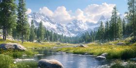 mountain landscape river meadow wildflowers forest coniferous trees snow capped mountains peaks sky clouds nature scenic serene peaceful tranquil beautiful vibrant lush green yellow rocks outdoor environment panorama view landscape photography digital art illustration artistic graphical mountain scenery alpine wilderness flora fauna water reflection sunlight natural light summer spring untouched nature scenic viewSimilar Photos