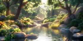 Serene Forest Stream Sunlit Nature Scene Lush Greenery Tranquil