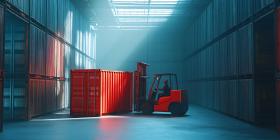 warehouse logistics forklift distribution center container shipping cargo industry transportation supply chain business commerce efficiency modern technology machinery equipment storage inventory management operations industrial factory manufacturing production movement transport delivery red container metal shelving corridor aisle blue cool tones bright lighting professional organized workplace efficient precision large scale operation industrial setting warehousingSimilar Photos