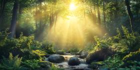 forest sunlight sunbeams nature trees leaves green lush foliage peaceful serene tranquil calm stream water rocks path woods landscape scenic background wallpaper website design illustration texture vibrant bright golden yellow environment eco organic natural beauty photography picture scene view outdoors habitat flora vegetationSimilar Photos