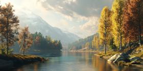 Autumn River Valley Landscape Majestic Mountains and Golden Tree