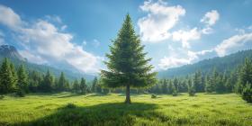 Majestic Evergreen Tree in Mountain Meadow Scenic Landscape Phot