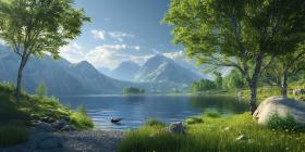 lake mountain mountains landscape scenery nature scenic view outdoor outdoors trees forest woodland sunlight sun sky clouds water reflection peaceful serene tranquil calm relaxing digital art painting illustration background wallpaper desktop background design element graphic design art artwork visual image asset pretty beautiful amazing photorealistic environment sceneSimilar Photos