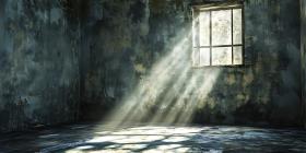 Ethereal Light Beams in Derelict Room Dramatic Architectural Pho