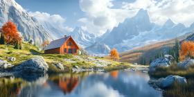 Mountain Lake Cabin Scene Autumnal Colors and Majestic Peaks