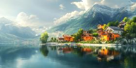 Stunning Alpine Lake Village Breathtaking Scenic Vista