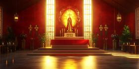 chapel church altar christmas religious festive holiday winter spiritual religious art immaculate conception virgin mary candles christmas tree interior design digital art render illustration artwork scene holy faith belief christianity catholic religion sacred worship divine red walls golden light peaceful solemn atmosphere decorations holiday season artistic visual beautiful vibrant high resolutionSimilar Photos