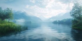 Serene River Landscape Misty Mountains and Lush Greenery