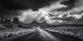Dramatic Monochrome Landscape Road to Ruins Under a Stormy Sky