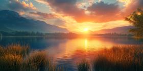 sunset lake mountains golden hour landscape nature scenic view panorama calm peaceful tranquil serene beautiful vibrant colors sky clouds water reflection hills horizon twilight evening sun rays light scene background art artwork digital art illustration graphic design photography travel adventure escape relaxation meditation peaceSimilar Photos