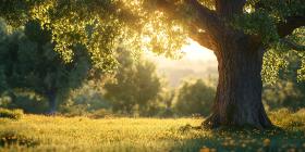 Majestic Oak Tree at Sunset A Serene Landscape Panorama