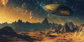 Alien Landscape with Rugged Mountains Background, Otherworldly Terrain with Jagged, Rocky Peaks and an Unusual Sky Above
