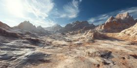 Alien Landscape with Rugged Mountains Background, Otherworldly Terrain with Jagged, Rocky Peaks and an Unusual Sky Above
