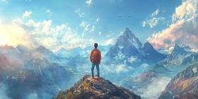 Asian traveler looking at a mountain landscape under a sunny sky background, a serene scene of exploration with majestic peaks and clear blue skies.
