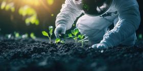 Astronaut Planting Green Seedlings in Soil Background, Space Explorer Nurturing Plants with a Cosmic Landscape
