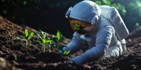 Astronaut Planting Green Seedlings in Soil Background, Space Explorer Nurturing Plants with a Cosmic Landscape