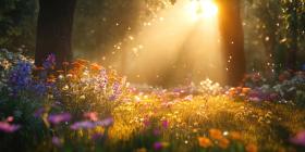 Beautiful Forest Field with Flowers Sunlight Background, Lush Green Field with Blooming Flowers and Warm Sunlight Filtering Through Trees
