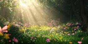 Beautiful Forest Field with Flowers Sunlight Background, Lush Green Field with Blooming Flowers and Warm Sunlight Filtering Through Trees