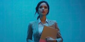 Beautiful Young Professional Woman in Business Attire Holding Folders with Copyspace Background, Confident Businesswoman Holding Documents in a Clean, Spacious Setting