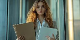 Beautiful Young Professional Woman in Business Attire Holding Folders with Copyspace Background, Confident Businesswoman Holding Documents in a Clean, Spacious Setting