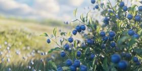 Blueberries growing on a bush in a field background, clusters of ripe, vibrant berries nestled among lush green leaves under an open sky.