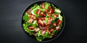 Bowl of Romaine Lettuce and Bacon Food with Copyspace Background, Fresh Salad with Crisp Lettuce and Savory Bacon Pieces in a Clean, Minimalist Setting