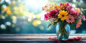 Bouquet of Colorful Flowers in Glass Vase on Wooden Table Background, Bright and Fresh Floral Arrangement in a Clear Vase Set on a Warm Wooden Surface