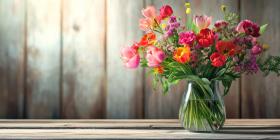 Bouquet of Colorful Flowers in Glass Vase on Wooden Table Background, Bright and Fresh Floral Arrangement in a Clear Vase Set on a Warm Wooden Surface