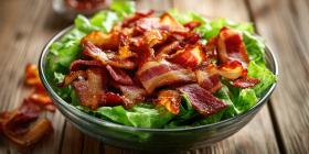 Bowl of Romaine Lettuce and Bacon Food with Copyspace Background, Fresh Salad with Crisp Lettuce and Savory Bacon Pieces in a Clean, Minimalist Setting