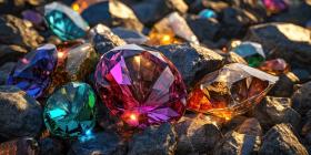 Broken gemstones rocky texture background, jagged shards of colorful gems scattered across a rough, textured surface, creating a striking and dynamic visual.