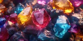Broken gemstones rocky texture background, jagged shards of colorful gems scattered across a rough, textured surface, creating a striking and dynamic visual.