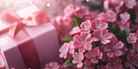 Bunch of pink flowers and wrapped gifts background, a charming arrangement of delicate pink blooms paired with elegantly wrapped presents, evoking a sense of celebration and joy.
