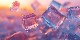 Clear ice cubes background, perfectly formed ice cubes with sharp edges, placed on a smooth surface, reflecting light and creating a cool, crisp atmosphere with subtle glistening effects.