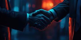 Closeup of two people shaking hands in a business deal background, with firm hand grips symbolizing trust and agreement, set against a professional office environment or neutral backdrop.