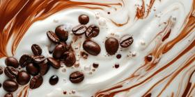 Coffee Beans Swirl in Creamy Frothy Liquid Background, Rich Espresso Mixing with Creamy Foam, Creating a Smooth and Inviting Coffee Texture