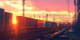 Colorful cargo containers on a train during sunset, with the warm hues of the setting sun casting a golden glow over the containers, symbolizing the movement of goods and global trade in a dynamic logistics scene.