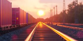 Colorful cargo containers on a train during sunset, with the warm hues of the setting sun casting a golden glow over the containers, symbolizing the movement of goods and global trade in a dynamic logistics scene.