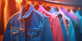 Colorful denim jackets hanging on a rack in a clothing store background, a stylish display featuring jackets in various vibrant shades, neatly arranged under warm lighting, creating a trendy and inviting shopping ambiance.