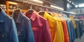 Colorful denim jackets hanging on a rack in a clothing store background, a stylish display featuring jackets in various vibrant shades, neatly arranged under warm lighting, creating a trendy and inviting shopping ambiance.