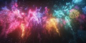 Colorful fireworks display lighting up the night sky background, vibrant bursts of red, blue, and gold illuminating the dark sky in a dazzling, festive spectacle.