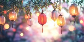 Colorful Lanterns Hang in Air Glowing Softly with Warm Bokeh Light Background, Vibrant Lanterns Casting a Gentle Glow Amidst a Dreamy, Bokeh-Filled Setting