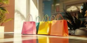 Colorful Shopping Bags on Counter Background, Bright and Vibrant Shopping Bags Arranged Neatly on a Clean Countertop