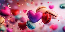 Colorful multiple heart-shaped macarons background, a delightful assortment of pastel-colored heart-shaped macarons arranged in a playful pattern, creating a sweet and charming atmosphere with soft, delicate textures.