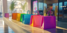 Colorful Shopping Bags on Counter Background, Bright and Vibrant Shopping Bags Arranged Neatly on a Clean Countertop