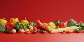Colorful vegetables with copyspace on solid background, a vibrant mix of fresh vegetables like bell peppers, tomatoes, and carrots arranged neatly, with ample space for text or branding.