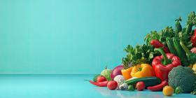 Colorful vegetables with copyspace on solid background, a vibrant mix of fresh vegetables like bell peppers, tomatoes, and carrots arranged neatly, with ample space for text or branding.