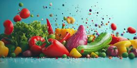 Colorful vegetables with copyspace on solid background, a vibrant mix of fresh vegetables like bell peppers, tomatoes, and carrots arranged neatly, with ample space for text or branding.