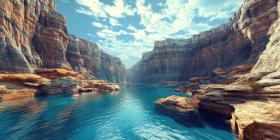 Deep Canyon with Blue River Flowing Between Rocky Cliffs Background, Majestic Landscape with a Winding River Surrounded by Towering Rocky Cliffs